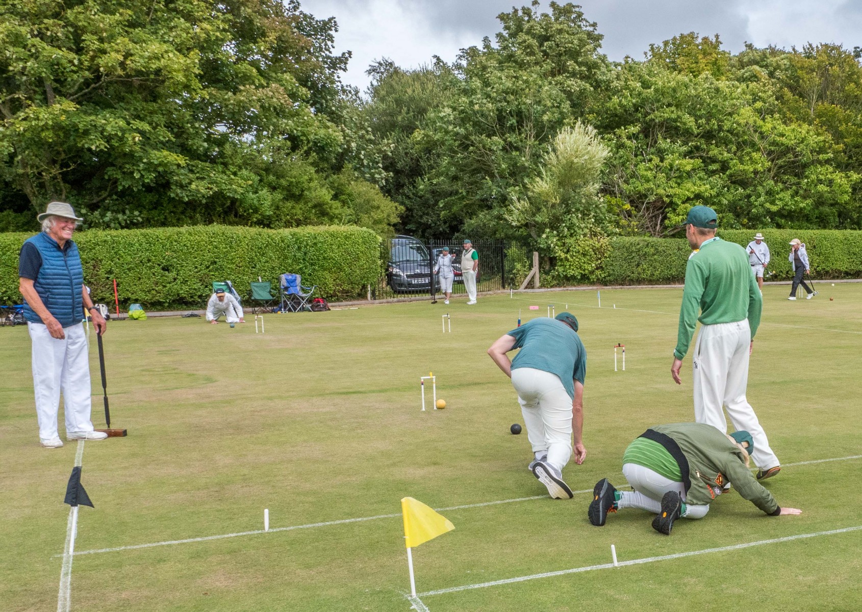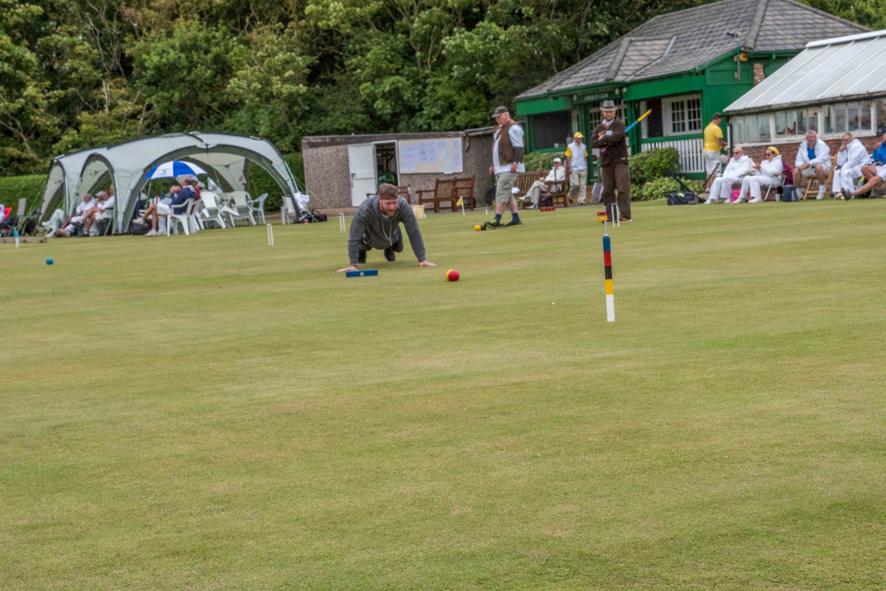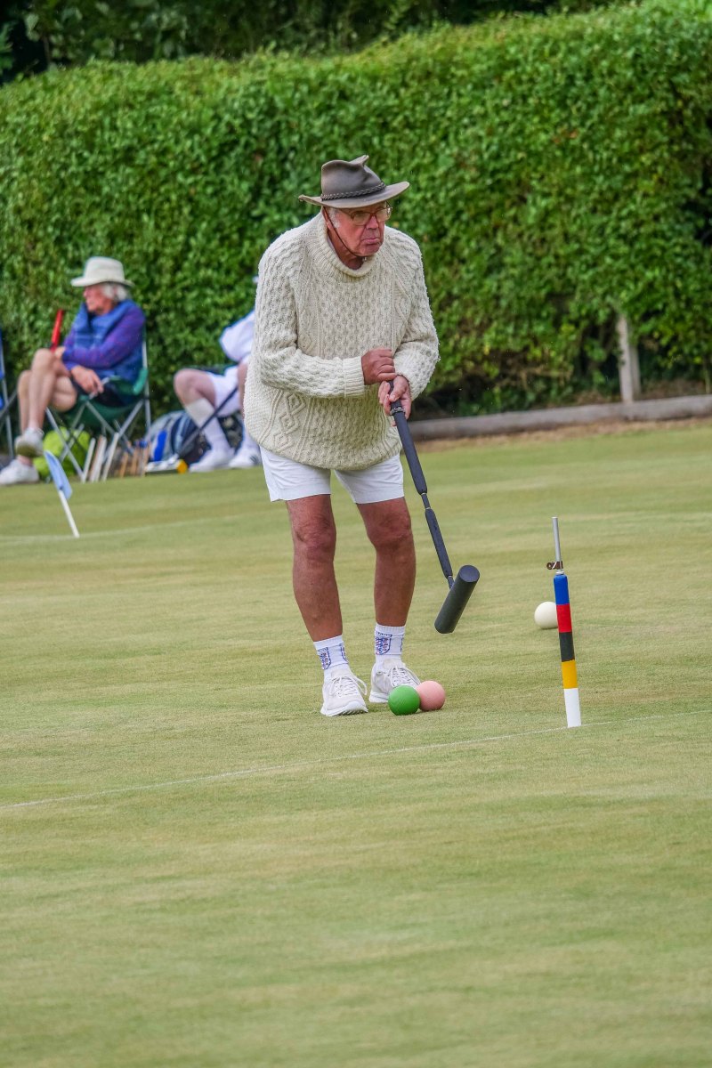 While many a good game was played the best rumble was between Ged and Phil in the final round played in strong Sunshine. It provided wonderful entertainment for the spectators: Ged was on 5 and peg, Phil on 1 and 1 when Phil got in and pegged Ged out. The ensuing three ball ending between these two talented players ( each with one bisque remaining) was a treat to watch. Both players favoured the direct break building approach without much hiding, lurking or taking pos.