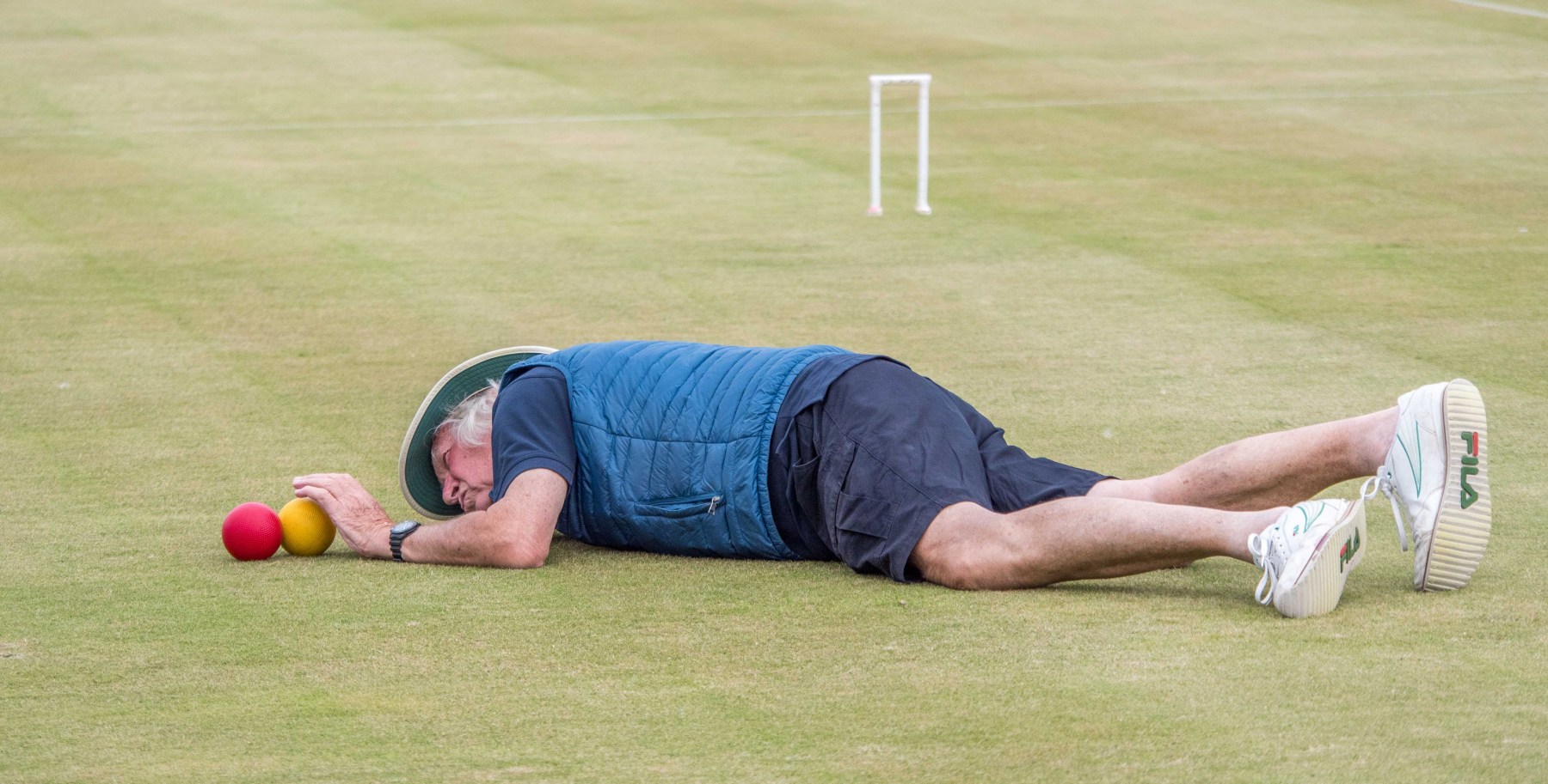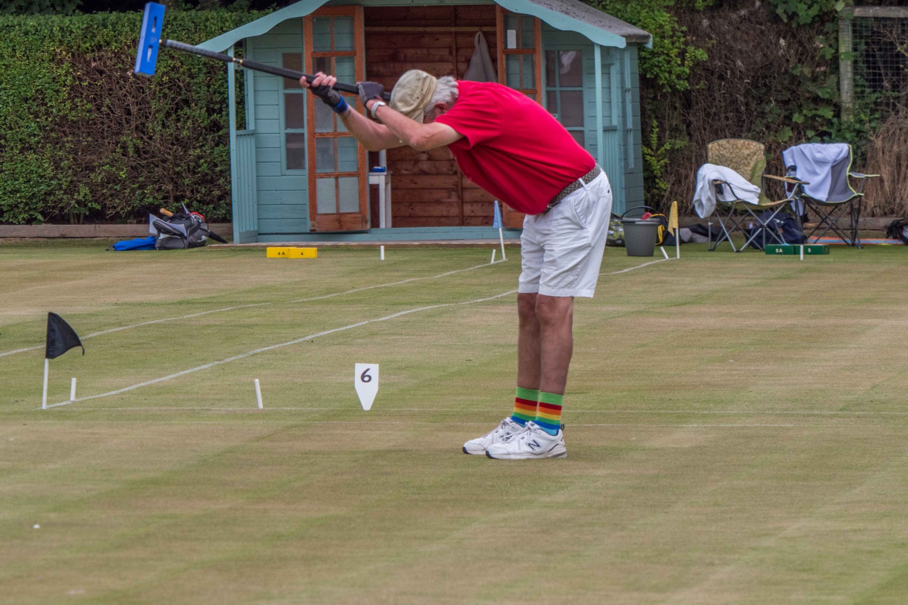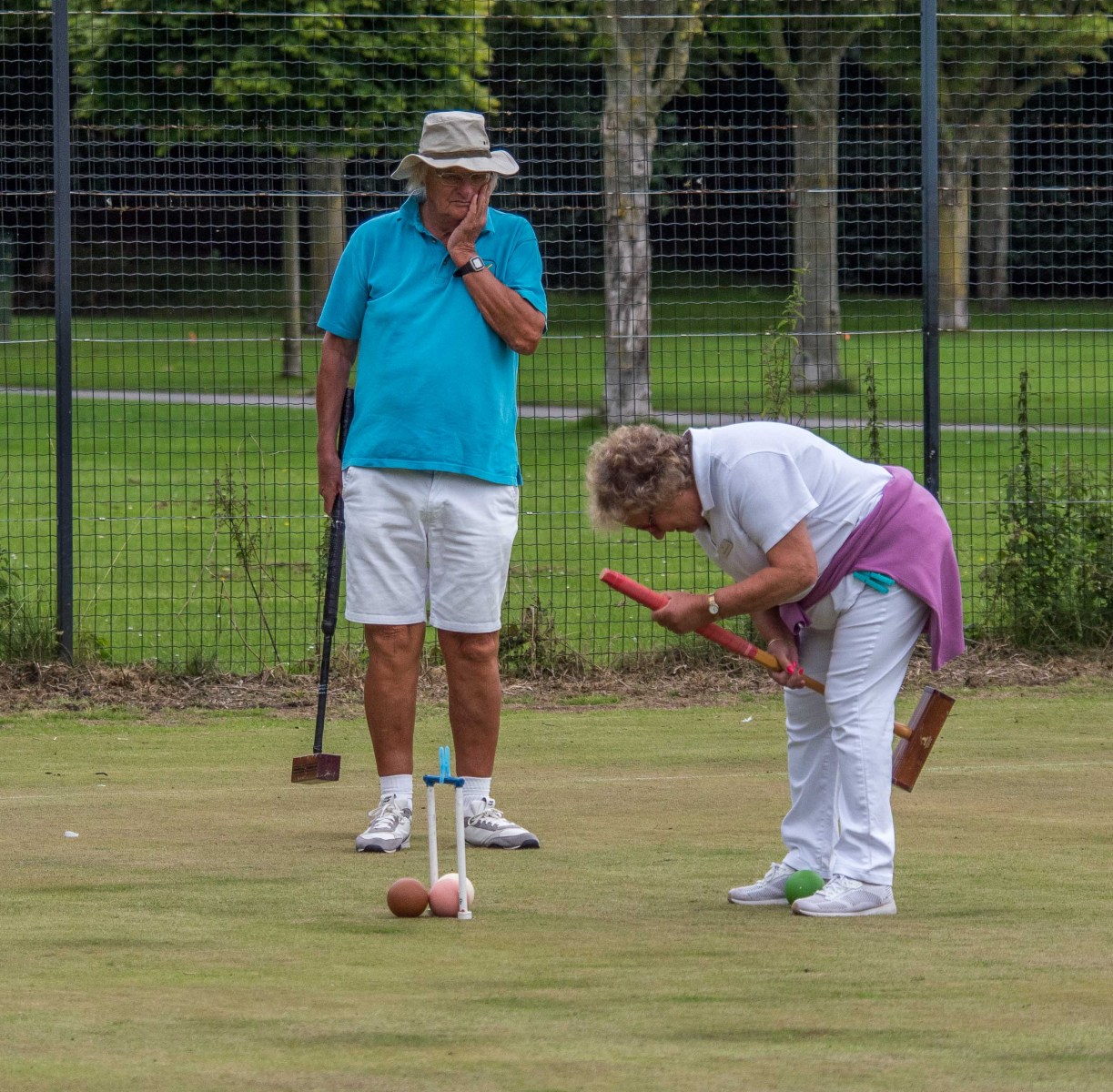 While many a good game was played the best rumble was between Ged and Phil in the final round played in strong Sunshine. It provided wonderful entertainment for the spectators: Ged was on 5 and peg, Phil on 1 and 1 when Phil got in and pegged Ged out. The ensuing three ball ending between these two talented players ( each with one bisque remaining) was a treat to watch. Both players favoured the direct break building approach without much hiding, lurking or taking pos.